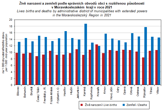 Graf 27-1. Živě narození a zemřelí podle správních obvodů obcí s rozšířenou působností v Moravskoslezském kraji v roce 2021