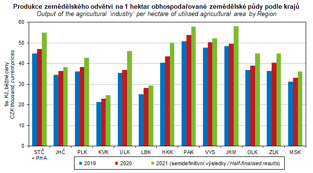 Graf 11-1. Produkce zemědělského odvětví na 1 hektar obhospodařované zemědělské půdy podle krajů