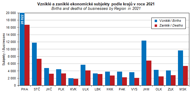 Graf 10-1. Vzniklé a zaniklé ekonomické subjekty podle krajů v roce 2021