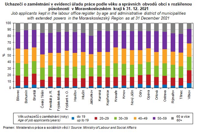 Graf 27-3. Uchazeči o zaměstnání v evidenci úřadu práce podle věku a správních obvodů obcí s rozšířenou působností v Moravskoslezském kraji k 31. 12. 2021