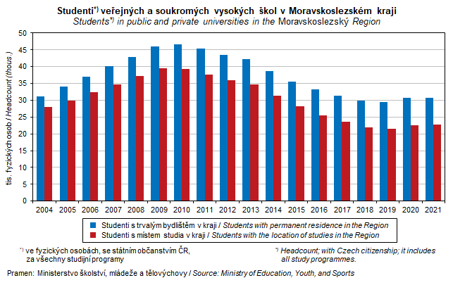 Graf 20-1. Studenti veřejných a soukromých vysokých škol v Moravskoslezském kraji