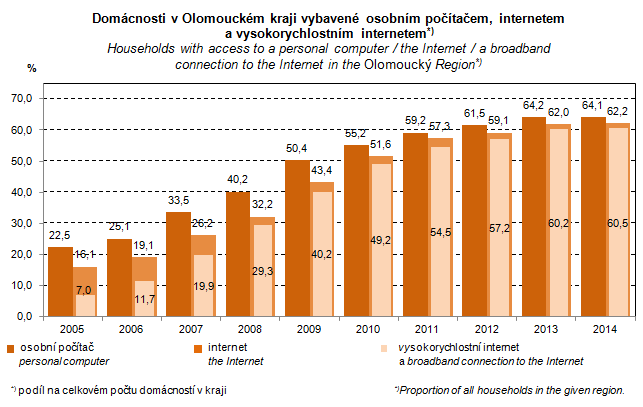 Graf 24. Domácnosti v Olomouckém kraji vybavené osobním počítačem, internetem a vysokorychlostním internetem