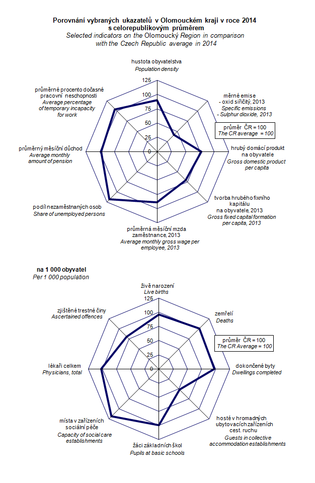 Graf 1. Porovnání vybraných ukazatelů v Olomouckém kraji v roce 2014 s celorepublikovým průměrem