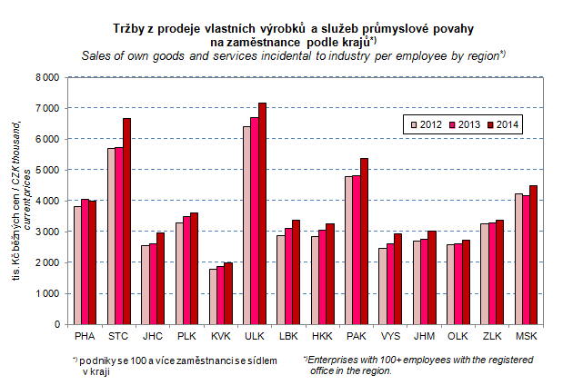 Graf 19. Tržby z prodeje vlastních výrobků a služeb průmyslové povahy na zaměstnance podle krajů