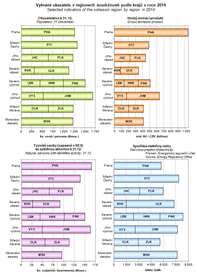 Graf 29. Vybrané ukazatele v regionech soudržnosti podle krajů v roce 2014