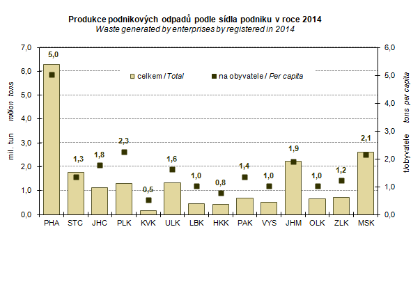 Graf 5. Produkce podnikových odpadů podle sídla podniku v roce 2014