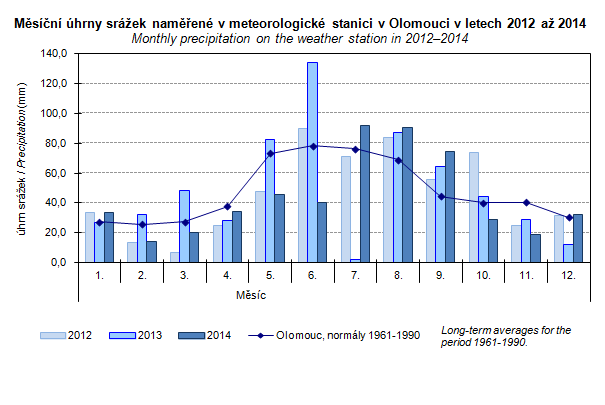 Graf 2. Měsíční úhrny srážek naměřené v meteorologické stanici v Olomouci v letech 2012 až 2014