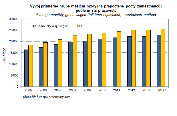 Graf 14. Vývoj průměrné hrubé měsíční mzdy (na přepočtené počty zaměstnanců) podle místa pracoviště
