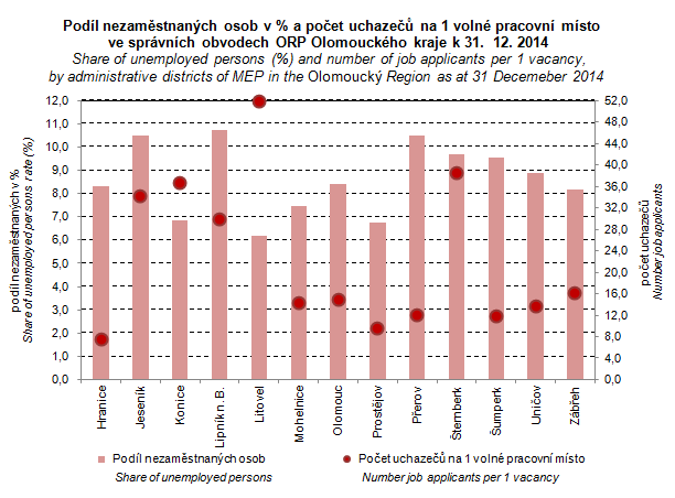 Graf 28. Podíl nezaměstnaných osob v % a počet uchazečů na 1 volné pracovní místo ve správních obvodech ORP Olomouckého kraje k 31. 12. 2014