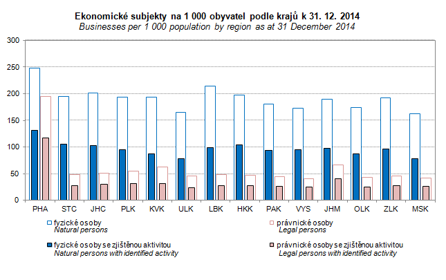 Graf 17. Ekonomické subjekty na 1 000 obyvatel podle krajů k 31. 12. 2014