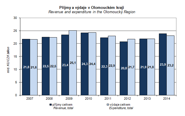 Graf 13. Příjmy a výdaje v Olomouckém kraji