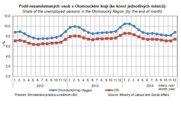 Graf 16. Podíl nezaměstnaných osob v Olomouckém kraji (ke konci jednotlivých měsíců)