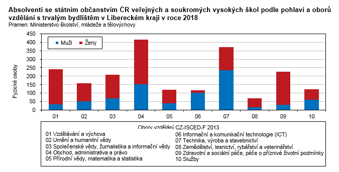 Absolventi se státním občanstvím ČR veřejných a soukromých vysokých škol podle pohlaví a oborů vzdělání s trvalým bydlištěm v Libereckém kraji v roce 2018