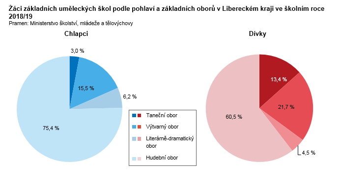 Žáci základních uměleckých škol podle pohlaví a základních oborů v Libereckém kraji ve školním roce 2018/19