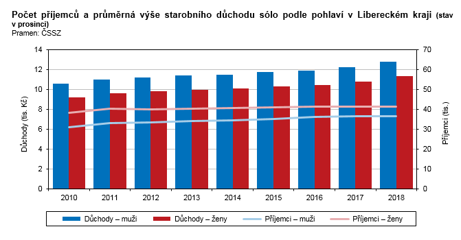 Počet příjemců a průměrná výše starobního důchodu sólo podle pohlaví v Libereckém kraji