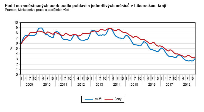 Podíl nezaměstnaných osob podle pohlaví a jednotlivých měsíců v Libereckém kraji