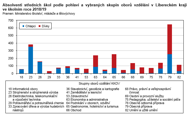 Absolventi středních škol podle pohlaví a vybraných skupin oborů vzdělání v Libereckém kraji ve školním roce 2018/19