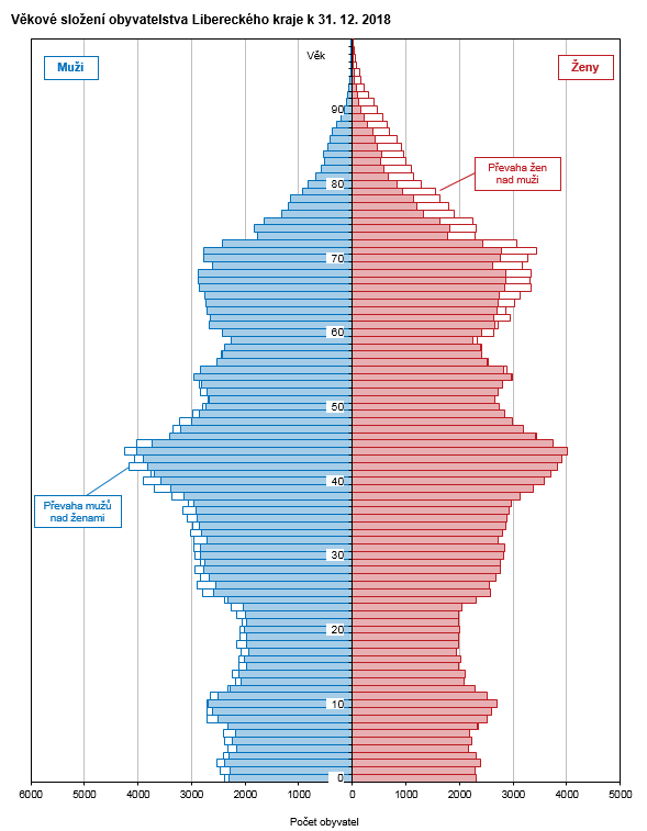 Věkové složení obyvatelstva Libereckého kraje k 31. 12. 2018