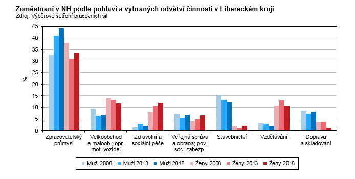 Zaměstnaní v NH podle pohlaví a vybraných odvětví činnosti v Libereckém kraji