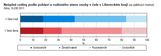 Neúplné rodiny podle pohlaví a rodinného stavu osoby v čele v Libereckém kraji