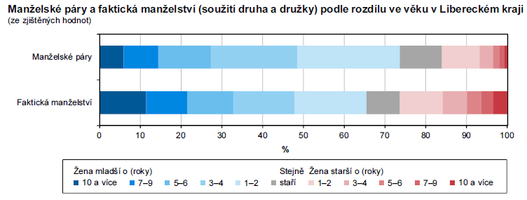 Manželské páry a faktická manželství (soužití druha a družky) podle rozdílu ve věku v Libereckém kraji