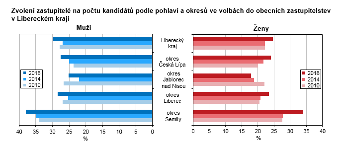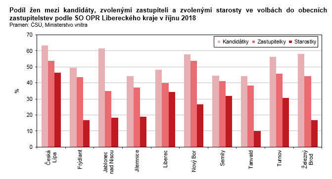Podíl žen mezi kandidáty, zvolenými zastupiteli a zvolenými starosty ve volbách do obecních zastupitelstev podle SO OPR Libereckého kraje v říjnu 2018