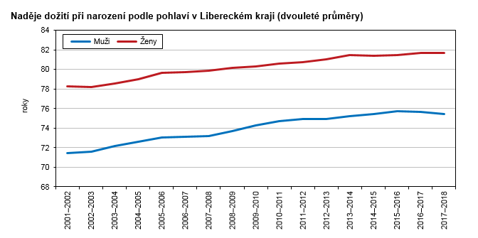 Naděje dožití při narození podle pohlaví v Libereckém kraji