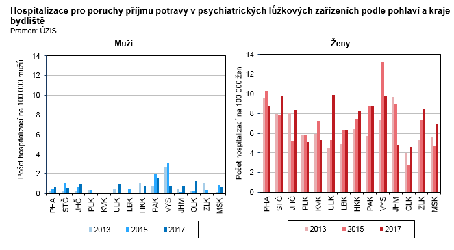 Hospitalizace pro poruchy příjmu potravy v psychiatrických lůžkových zařízeních podle pohlaví a kraje bydliště