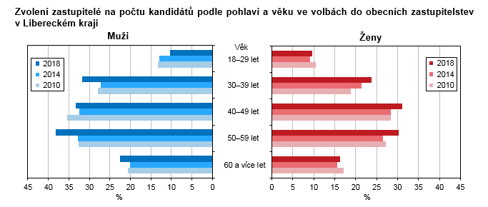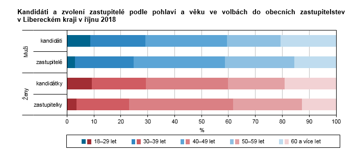 Kandidáti a zvolení zastupitelé podle pohlaví a věku ve volbách do obecních zastupitelstev v Libereckém kraji v říjnu 2018