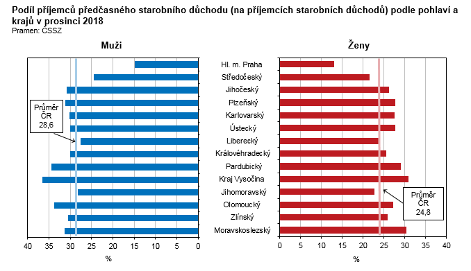 Podíl příjemců předčasného starobního důchodu (na příjemcích starobních důchodů) podle pohlaví a krajů v prosinci 2018