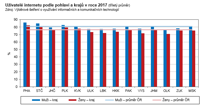 Uživatelé internetu podle pohlaví a krajů v roce 2017
