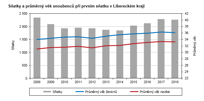 Sňatky a průměrný věk snoubenců při prvním sňatku v Libereckém kraji