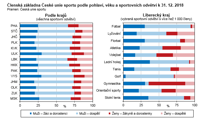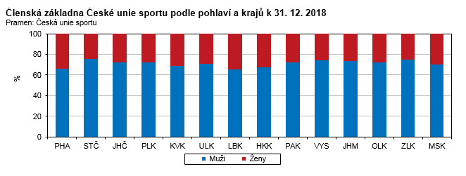 Členská základna České unie sportu podle pohlaví a krajů k 31. 12. 2018