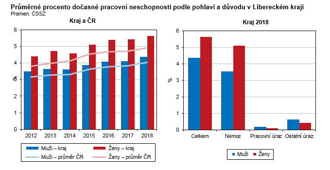 Průměrné procento dočasné pracovní neschopnosti podle pohlaví a důvodu v Libereckém kraji