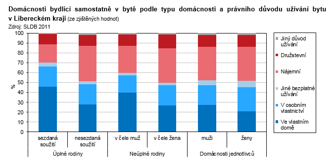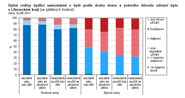 Úplné rodiny bydlící samostatně v bytě podle druhu domu a právního důvodu užívání bytu v Libereckém kraji
