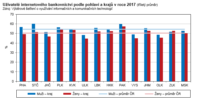 Uživatelé internetového bankovnictví podle pohlaví a krajů v roce 2017