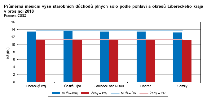 Průměrná měsíční výše starobních důchodů plných sólo podle pohlaví a okresů Libereckého kraje v prosinci 2018