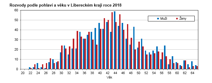 Rozvody podle pohlaví a věku v Libereckém kraji roce 2018