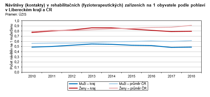 Návštěvy (kontakty) v rehabilitačních (fyzioterapeutických) zařízeních na 1 obyvatele podle pohlaví v Libereckém kraji a ČR