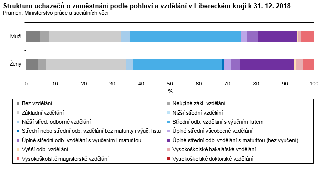 Struktura uchazečů o zaměstnání podle pohlaví a vzdělání v Libereckém kraji k 31. 12. 2018