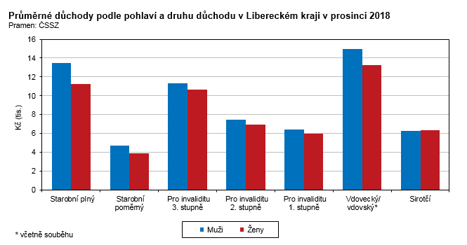 Průměrné důchody podle pohlaví a druhu důchodu v Libereckém kraji v prosinci 2018