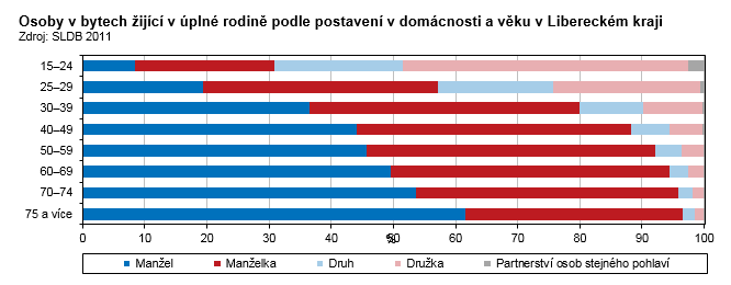 Osoby v bytech žijící v úplné rodině podle postavení v domácnosti a věku v Libereckém kraji