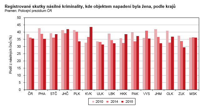 Registrované skutky násilné kriminality, kde objektem napadení byla žena, podle krajů