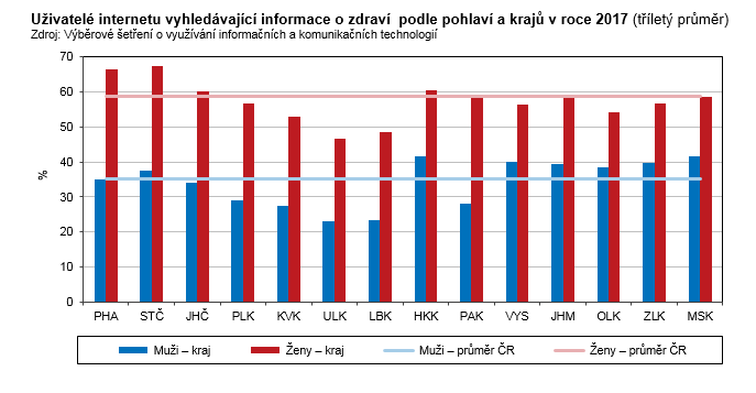 Uživatelé internetu vyhledávající informace o zdraví podle pohlaví a krajů v roce 2017