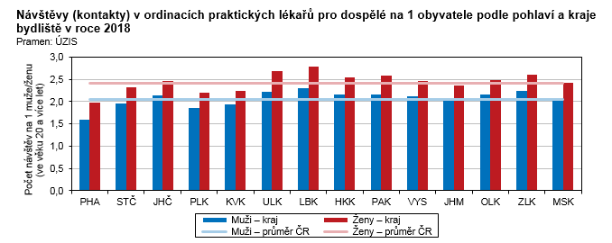 Návštěvy (kontakty) v ordinacích praktických lékařů pro dospělé na 1 obyvatele podle pohlaví a kraje bydliště v roce 2018
