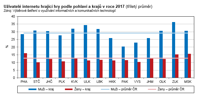 Uživatelé internetu hrající hry podle pohlaví a krajů v roce 2017
