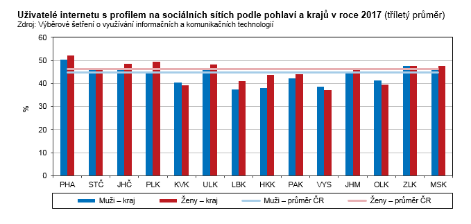 Uživatelé internetu s profilem na sociálních sítích podle pohlaví a krajů v roce 2017