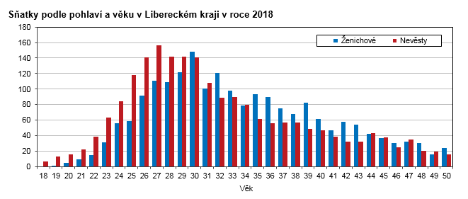 Sňatky podle pohlaví a věku v Libereckém kraji v roce 2018