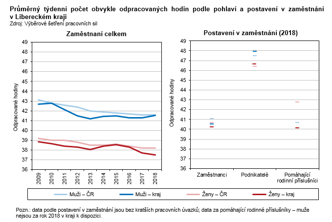 Průměrný týdenní počet obvykle odpracovaných hodin podle pohlaví a postavení v zaměstnání v Libereckém kraji
