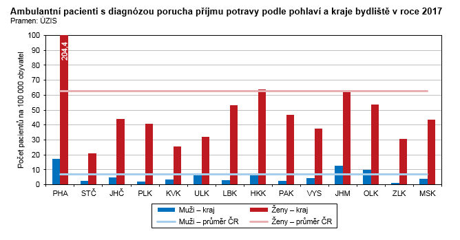 Ambulantní pacienti s diagnózou porucha příjmu potravy podle pohlaví a kraje bydliště v roce 2017